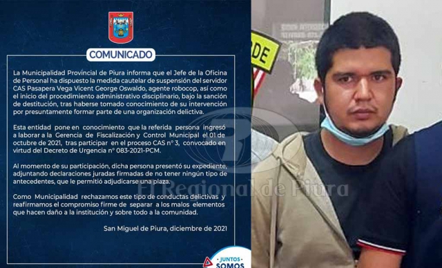 ERP. La Municipalidad Provincial de Piura anunció mediante un comunicado que el jefe de la Oficina de Personal ha dispuesto la medida cautelar de suspensión del servidor CAS Pasapera Vega Vicent George Oswaldo, agente robocop, así como el inicio del procedimiento administrativo disciplinario, bajo la sanción de destitución, tras haberse tomado conocimiento de su intervención por presuntamente formar parte de una organización delictiva.