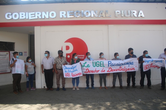 ERP. Un grupo de docentes que prestan servicios en el distrito de Pacaipampa en la provincia de Ayabaca, realizaron un plantón en la sede del gobierno regional de Piura, reclamando la creación de la Unidad de Gestión Educativa del indica distrito, que permita organizar mejor sus servicios. En la fecha lograron reunirse con un consejero regional y el gerente con quienes convinieron una próxima reunión el 20 de diciembre.