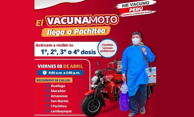 Pero, además, otro grupo de vacunadores se movilizarán en un “vacunamoto” para recorrer las calles Huallaga, Marañón, Amazonas, San Martín, 1° Pachitea y Lambayeque con el objetivo de aplicar la dosis que corresponda a los vecinos de este sector, especialmente a los adultos mayores o personal vulnerables que no puedan acudir a los puntos fijos.