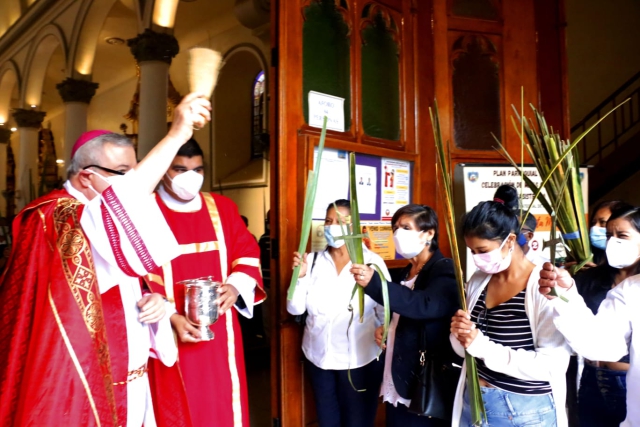 Al inicio de la Eucaristía, monseñor Eguren Anselmi bendijo los ramos de todos los fieles presentes, para luego dirigirse en procesional hacia el altar principal mientras todos agitaban sus palmas y ramos, conmemorando así la entrada triunfal del Señor Jesús en Jerusalén.