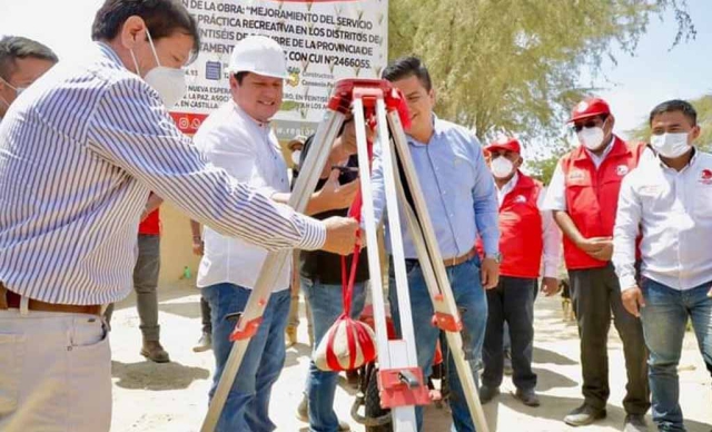 ERP. La autoridad regional, Servando García Correa; el regidor de Castilla, Mauricio Mijahuanga Berrú y el gerente regional de Infraestructura, Wilmer Vise Ruíz colocaron la primera piedra para dar inicio a la construcción de dos modernos polideportivos en beneficio de miles de vecinos de los sectores de Virgen de la Paz y Villa California.