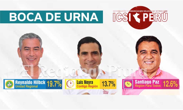 ERP. Las Elecciones Regionales y Municipales 2022, se realizaron en con relativa normalidad en la región Piura. De acuerdo a la encuesta a ‘Boca de Urna’ realizada por ICSI Perú, el candidato Reynaldo Hilbck de Unidad Regional habría logrado el 19.7% de los votos, en tanto que Luis Neyra le seguiría con el 13.7% y Santiago Paz con 12.6%; lo que implica que existe un empate técnico en segundo lugar.