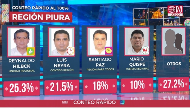 ERP. La Encuestadora Ipsos, mediante estudio de conteo rápido, el mismo que se realiza con actas reales, confirmó que los candidatos Reynaldo Hilbck Guzmán de Unidad Regional quien obtuvo el 25.3% de los votos y Luis Neyra León de Contigo Regional que obtuvo el 21.5% irán a una segunda vuelta electoral por la gobernación regional de Piura. Neyra superó a Santiago Paz López que solo logeó el 16%.