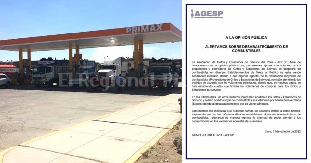 ERP/C.Chávez. La Asociación de Grifos y Estaciones de Servicios del Perú (AGESP) mediante comunicado alertó que el desabastecimiento de combustible se debe por razones ajenas a la voluntad de los propietarios y operadores de grifos y Estaciones de Servicios. Según indican, el menor stock se produce porque algunos agentes de la distribución mayorista de combustibles, es decir, los proveedores de grifos y estaciones de servicio, no están atendiendo los pedidos de acuerdo con los volúmenes solicitados.
