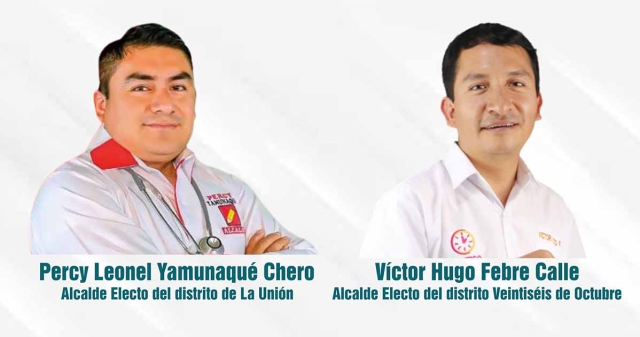 ERP. La Oficina Nacional de Procesos Electorales confirmó el triunfo del partido político Perú Libre en el distrito de La Unión y del movimiento Contigo Región, en Veintiséis de Octubre, al culminar el procesamiento y contabilización de las actas pendientes. De acuerdo al resultado oficial Percy Leonel Yamunaqué Chero y Víctor Hugo Febre Calle se convierten en alcaldes electos de su jurisdicción.
