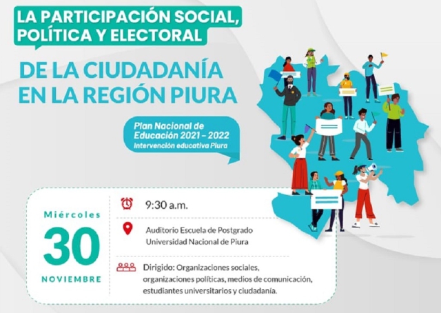 ERP. Como parte del Plan Nacional de Educación y Formación Cívica (PNEF) 2021-2024, el Jurado Nacional de Elecciones (JNE) desarrollará, este miércoles 30 en Piura, un conversatorio sobre la importancia de la participación social, política y electoral de los ciudadanos en el desarrollo sostenido de dicha región del norte del país.
