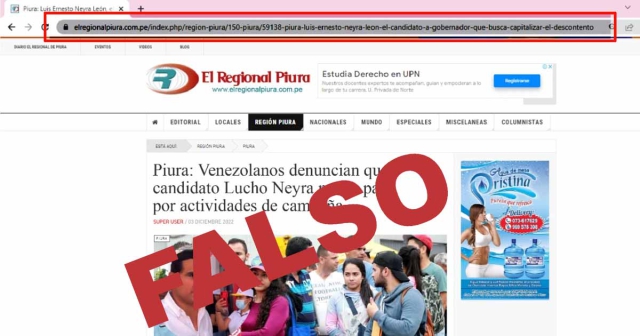 ERP. Sujetos inescrupulosos que pretenderían crear un clima adverso a la candidatura del abogado Luis Neyra León, han suplantado noticias de este medio; en tal sentido, hacemos un llamado a la población de Piura a verificar nuestros contenidos en la web www.elregionalpiura.com.pe. Respecto a lo mencionado precisamos que es una suplantación grosera, que no corresponde a la nota publicada por el Diario y cuyo link adjuntamos.