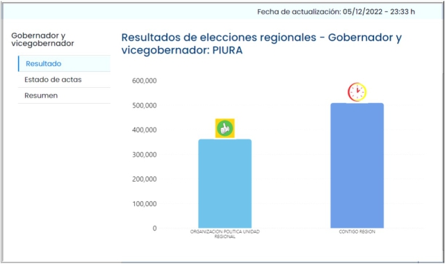 De acuerdo a la información oficial del total de actas que corresponden a la región Piura, se han procesado 4,855 (100.000 %); en tanto que las contabilizadas son 4,826 (99.403 %) restando solo 29 actas para culminar con el proceso de contabilización. Lo que llama la atención de la segunda vuelta electoral regional de Piura, es el alto ausentismo el mismo que fue de 461,695 electores, equivalente al 32.427 %.