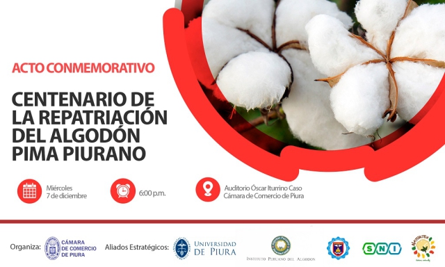 ERP. La Cámara de Comercio y Producción de Piura en alianza con la Universidad de Piura, Instituto Peruano del Algodón, Universidad Nacional de Piura, Sociedad Nacional de Industrias y Naturtex, llevarán a cabo este 7 de diciembre, una ceremonia especial para recordar el Centenario de la Repatriación del Algodón Pima Piurano, cuyas semillas fueron traídas en 1922 desde el Condado Pima de Arizona en EE. UU.