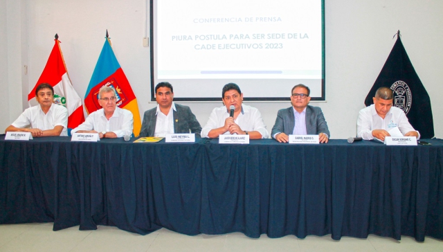 ERP. Mediante conferencia de prensa, la mesa técnica multisectorial impulsora de la iniciativa, presentó oficialmente la postulación de Piura como sede de la CADE Ejecutivos 2023, que se llevará a cabo del 14 al 16 de noviembre, para tal efecto, se reunieron en la Cámara de comercio de Piura, las autoridades más representativas del departamento.