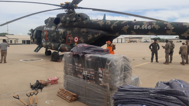 En el vuelo del helicóptero de la FAP, que se realizó esta mañana, el GR Piura trasladó dos toneladas de ayuda consistente en calaminas, triplay, plástico, listones de madera, clavos, bienes de abrigo, kits de utensilios de cocina y herramientas como barretas, hachas, machetes, picos, carretillas y lampas para la ejecución de trabajos comunales.