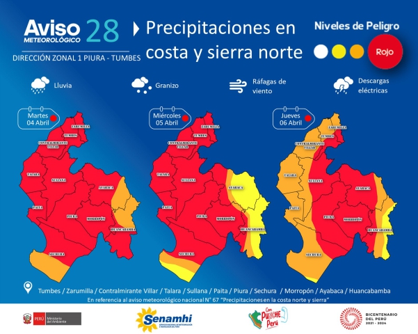 ERP. De acuerdo al Servicio Nacional de Meteorología e Hidrología, durante los días, 4, 5 y 6 de abril, se seguirán presentando lluvias entre moderadas y fuertes en todo el ámbito de la región Piura. Según el Aviso 28, que se desprende del nacional, las posibilidades de altas precipitaciones podrían presentarse en Tumbes, Zarumilla y Contralmirante Villar, en tanto que en Piura, Sullana, Talara, Sechura, Paita, Morropón e incluso Ayabaca y Huancabamba.