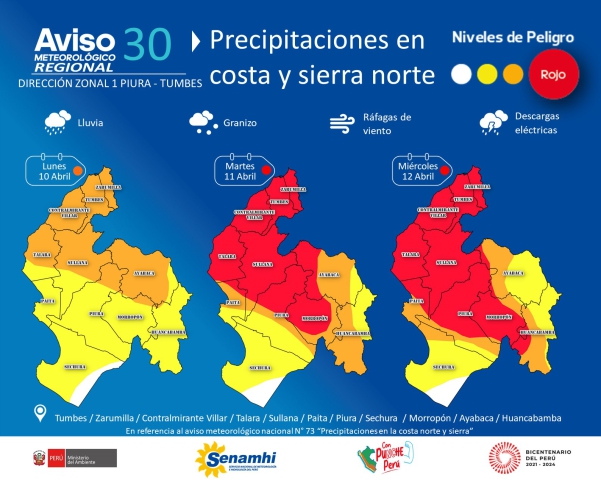Conforme se puede observar en la alert "entre el lunes 10 al miércoles 12 de abril, se presentarán precipitaciones (nieve, granizo, aguanieve y lluvia) de moderada a extrema intensidad en la Costa norte y Sierra".