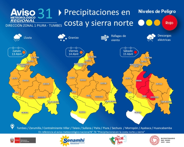 ERP. De acuerdo al Aviso 31 emitido por el Servicio Nacional de Meteorología e Hidrología, aún se mantienen las condiciones climáticas y los riesgos subsisten. Para el jueves 13 de abril, existe Alerta naranja para las zonas costeras y de sierra norte de las regiones de Piura y Tumbes, situación similar se replicará el 14 y en el caso del 15 de abril, el nivel de alerta roja comprende la provincia de Sullana y Piura.