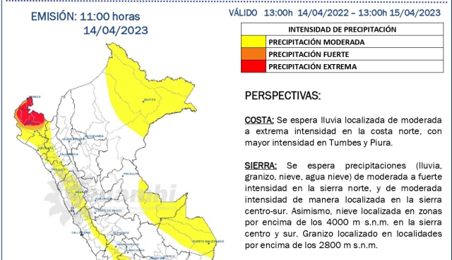 "Sin embargo para Tumbes, las precipitaciones están más ligados a lo que ocurra en la parte alta de la cabecera de la cuenca Puyango en la zona ecuatoriana, hay que recordar que el INAMHI en el Ecuador ha emitido un aviso meteorológico de alerta en color rojo para las zonas altas, es decir para la zona de Puyango (Por lo que se mantiene latente la ocurrencia de nuevas crecidas hidrológicas en el rio Tumbes para los próximos días), mientras que para Piura igualmente algunas lluvias ya se van fortaleciendo desde hoy hasta el domingo que se presentarían bastante intensas (inclusive estaría presentando lluvias en las zonas costeras para hoy" precisó el especialista.