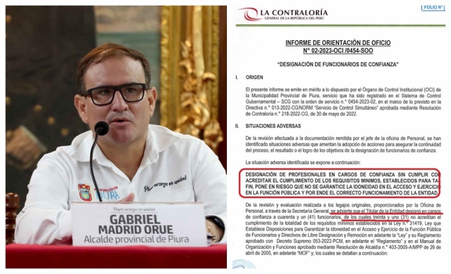 ERP. La nueva gestión del alcalde municipal de Piura, encabezada por Gabriel Madrid Orué, quien inició su mandato el 1 de enero del 2023, contrató 31 funcionarios para puestos de confianza que no cumplirían con los requisitos mínimos para ejercer tales funciones establecidos en la Ley 31419, según el informe de la Contraloría a la que accedió Vigilante.pe. El documento detalla que 9 de dichos puestos eran para gerencias.