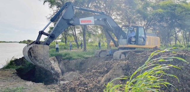 ERP. El Ministerio de Vivienda, Construcción y Saneamiento (MVCS), desplazó maquinaria de línea amarilla hacia la zona de San Antonio, distrito de Cura Mori, para el reforzamiento del dique en el río Piura con el fin de evitar que la erosión avance y pueda ocurrir una fractura que afecte a la población y campos de cultivo de la zona.