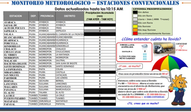 ERP. Otras 24 horas sin precipitaciones importantes en las regiones de Piura y Tumbes según el informe del Servicio Nacional de Meteorología e Hidrología para la tarde noche del 2 de mayo del 2023. La máxima lluvia de solo 2 mm se produjo en Sapillica, provincia de Ayabaca, en tanto que en todas las estaciones que se encuentran ubicadas en el indicado territorio no registraron valor alguno.