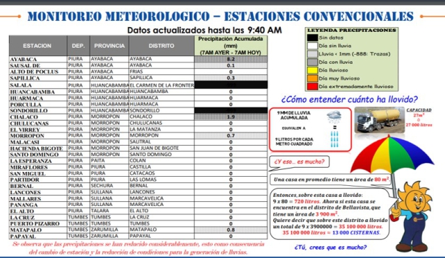 En las demás estaciones convencionales que se encuentran a cargo de la zonal 1 de Senamhi, no se registraron lluvias sustantivas, lo que de alguna manera indica que el comportamiento climatológico se viene normalizando no solo en Piura, sino igualmente en la región Tumbes, donde solo en Zarumilla se registró una lluvia muy débil de 0,8 mm.