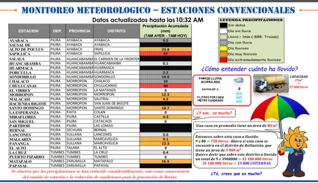 En Frías se registró una lluvia de 23.8 mm; en el caso de Chulucanas la precipitación fue de 40 mm; en santo Domingo de la provincia de Morropón, 18.7 mm; en la provincia de Huancabamba la mayor lluvia se registró en Sondorillo con 14.6 mm.