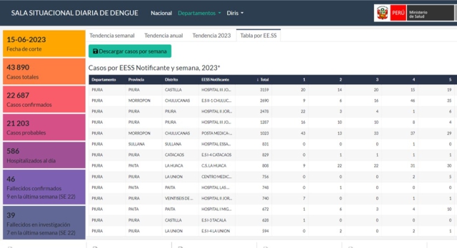 ERP. Pese al entusiasmo ministerial respecto a casos de dengue, en la región Piura se siguen presentando y lo peor muriendo. Hasta el momento de acuerdo a la información de la Sala Situacional Diaria, se tiene 43 890 casos totales, de los cuales 22 687 son confirmados en tanto que 21 203 probables. Los establecimientos de salud más requeridos para atender la enfermedad, son los de Piura, Castilla, Sullana, Chulucanas, entre otros.