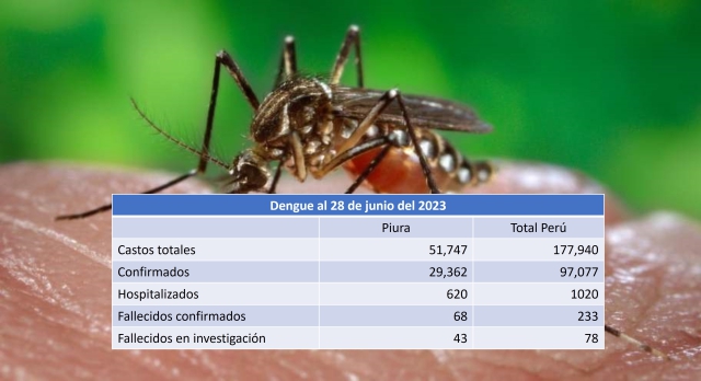 ERP. Aún no se logra controlar. Los casos totales de dengue en la región Piura siguen subiendo y la disminución es lenta. Al 28 de junio del presente, de acuerdo a la Sala Situacional Diaria se tiene 51,747, en tanto que los casos totales a nivel nacional llegan a 177,940. Lo preocupante es que siguen falleciendo pacientes, del total nacional que suman 311, a la región le corresponden 111.