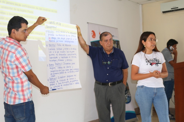 Finalmente, se realizaron trabajos de grupo, donde los participantes plantearon problemáticas, casos de desigualdad de género en el tema ambiental, y dieron recomendaciones para reducir las brechas de género como el empoderamiento de las mujeres rurales, fortalecer las capacidades y la institucionalidad en los gobiernos locales en relación al tema.