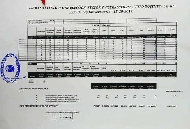 ERP. La Universidad Nacional de Piura, se encuentra de elecciones y las expectativas por conocer al nuevo rector se inician este 15 y culminarán el próximo 17 cuando los alumnos de dicha casa de estudios ejerzan su derecho a elegir. En tanto, realizado el cómputo de docentes, el oficialista Santos Leandro Montaño y el opositor Segundo Dioses Zárate obtuvieron la más alta votación de la elección de docentes.