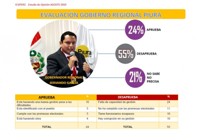 ERP. El gobernador regional de Piura Servando García Correa, sigue con alta desaprobación según el último sondeo de opinión realizado por la encuestadora ICSI Perú que dirige el Lic. Mauro Vegas Carmen. De acuerdo a este estudio, obtiene el 55% de piuranos que lo desaprueban por falta de capacidad de gestión, por incumplimiento de sus promesas electorales y por tener funcionarios incapaces.