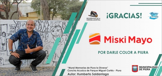 ERP. Como parte de nuestra política de Responsabilidad Social y en aras de promover la cultura y valores en la región norte, Compañía Minera Miski Mayo en alianza con la Municipalidad Provincial de Piura, participa como patrocinador del proyecto de recuperación de la concha acústica del Parque Infantil Miguel Cortés, auspiciando el pintado de un mural artístico a cargo del artista piurano Humberto Saldarriaga.