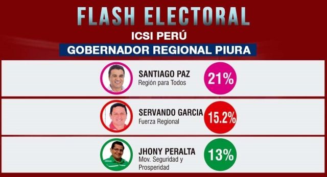 ERP. El conteo rápido que se realiza con actas de sufragio reales, concluye que la gobernación de Piura se definirá entre el candidato de Región para Todos Santiago Paz López y Servando García Correa de Fuerza Regional. De confirmarse con el cómputo total, irán el 9 de diciembre a definir en proceso eleccionario al gobernador para los próximos 4 años de gobierno.