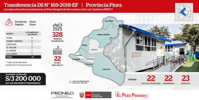 ERP. El Programa Nacional de Infraestructura Educativa (PRONIED), del Ministerio de Educación (Minedu), tiene previsto instalar 23 módulos educativos en colegios de seis distritos de la provincia de Piura, que están incluidos en el Plan Integral de Reconstrucción con Cambios (PIRCC).