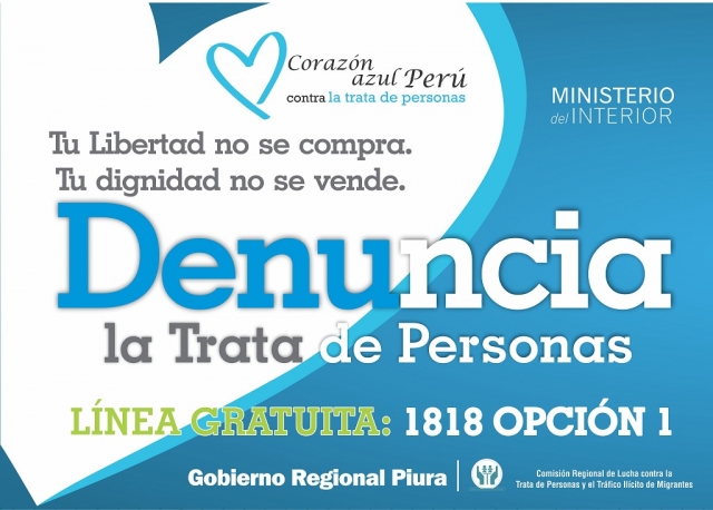 ERP. La trata de personas, es un problema social que es inconcebible en estos tiempos y requiere el apoyo de todos y todas para erradicarla. En tal sentido, la población de la región Piura, estará participando en la campaña internacional “Corazón Azul”, que se desarrollará el día miércoles 8 de agosto a las 3:00 p.m. en el frontis de la Municipalidad Provincial de Piura.