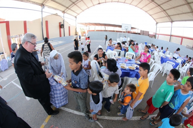 ERP. La Iglesia realizó la I Jornada Mundial de los Pobres, con la presencia del Arzobispo Metropolitano, Monseñor José Antonio Eguren Anselmi S.C.V., quien celebró esta importante fecha en la Parroquia Nuestra Señora del Tránsito de Castilla – Piura. Junto con su párroco, el R.P. Pedro Talledo Nizama, la Hna. Carmen Távara Vílchez de las Misioneras Parroquiales del Niño Jesús de Praga y de los miembros de la Pastoral Social de esta comunidad parroquial, quienes acogieron a cerca de 200 hermanos pobres e indigentes para agasajarlos con un rico almuerzo y con diversos regalos y sorpresas.