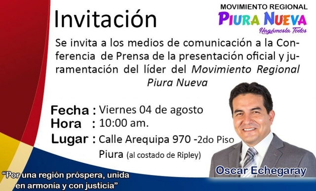 ERP. No es conocido más allá de los fueros del Consejo Regional de Piura, pero don Dr. Oscar Alex Echegaray Albán no se amilana e inicia el proceso para recolectar más de 65 mil firmas que se requieren para inscribir a un movimiento regional. El indicado consejero, ha decidido comprar su kit electoral el cual ha denominado Piura Nueva y lo estará presentando en conferencia de prensa.