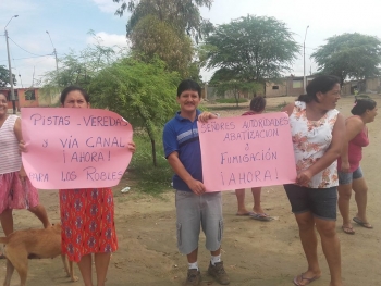 ERP. PIURA. Moradores de Los Robles, Armando Villanueva, 26 de Agosto, 6 de Agosto y San Judas Tadeo del distrito 26 de Octubre reclaman por ayuda a las autoridades locales, especialmente, del alcalde distrital Práxedes Llacsahuanga Huamán, debido a que por efecto de las fuertes lluvias sus viviendas se han visto afectadas y no cuentan con recursos para la compra de calaminas, además señalan que se han formado lagunas en diferentes sectores y solicitan una evacuación de aguas, así como una abatización y fumigación para evitar el contagio del dengue y la plaga de moscas.