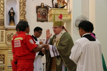 ERP. Ante una gran cantidad de fieles reunidos en la Basílica Catedral de nuestra ciudad, Monseñor José Antonio Eguren Anselmi S.C.V., Arzobispo Metropolitano de Piura presidió la Santa Misa correspondiente al XXX Domingo del Tiempo Ordinario la misma que fue ofrecida por el descanso eterno de los tres valerosos bomberos de la Compañía Roma 2, que fallecieron cumpliendo su deber el miércoles último.