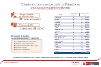 ERP. Los recursos transferidos son destinados para la continuidad de inversiones en 23 instituciones educativas y proyectos nuevos en 27 colegios.La región Piura recibió S/ 139 millones 651 mil 22 mediante transferencias realizadas al Gobierno Regional y diversas municipalidades, con la finalidad de ejecutar trabajos en 50 instituciones educativas, en beneficio de más de 7700 estudiantes.
