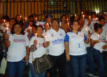 ERP. Decenas de simpatizantes del líder de Alianza para el Progreso, César Acuña Peralta, se apostaron en el frontis de la iglesia Catedral de Piura, como muestra de apoyo al candidato presidencial ante la penosa situación que viene atravesando ante el Jurado Nacional de Elecciones (JNE) y que se encuentra en espera de la decisión de este ente, donde definirá si se le excluye de manera definitiva o si sigue en carrera.