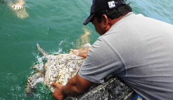 Piura. Una tortuga carey (Eretmochelys imbricata) que fue encontrada varada en la playa Punta Veleros del distrito de Los Órganos, en Talara, fue liberada por voluntarios de la Organización No Gubernamental (ONG) Ecoceánica, centro para la conservación integral de los ecosistemas marinos del Pacífico Este.