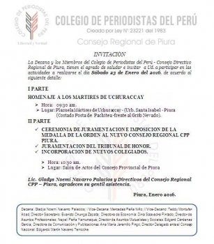 ERP. El sábado 23, en el Salón de Actos de la Municipalidad de Piura juramentará el nuevo Consejo Regional y el tribunal de Honor del Colegio de Periodistas de Piura. El acto protocolar se iniciará a las diez de la mañana y estará presidido por la Lic. Gladys Noemí Navarro Palacios, Decana Regional electa para el período 2016-2017, quien tomará el juramento de honor al pleno del Consejo Directivo Regional Piura y a los Integrantes del Tribunal de Honor Regional.