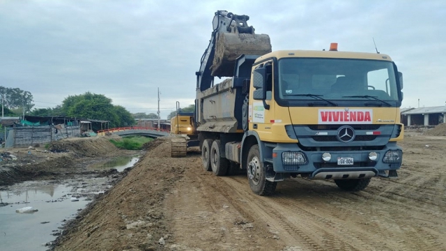 ERP. Ante la emergencia por lluvias en la región Piura, el Ministerio de Vivienda, Construcción y Saneamiento (MVCS) interviene con maquinaria pesada en seis puntos críticos de ríos, drenes y quebradas en los distritos de Chulucanas, Huancabamba, Tambogrande y Colán, donde se realiza la limpieza, descolmatación, encauzamiento y creación de diques.