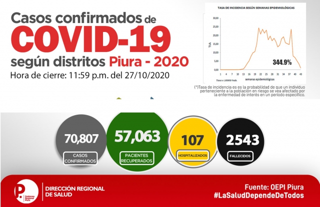 ERP. De acuerdo al reporte proporcionado por la Oficina de Epidemiología de la Dirección Regional de Salud de Piura, los casos de COVID-19 se mantienen igual que el reporte anterior; en tanto que hubo un ligero incremento de fallecidos, los cuales suman hasta la fecha 2,543. Los datos corresponden al 28 de octubre 00 horas.