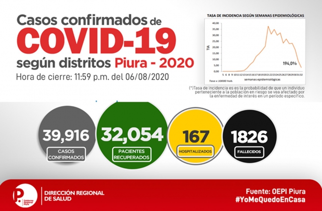 ERP. La Oficina de Epidiología de la Dirección Regional de Salud de Piura, informó que al 7 de agosto, 00 horas, los casos confirmados de Covid-19 llegan a 39,916; en tanto que el número de fallecidos a causa de la enfermedad son 1,826. La tasa de letalidad se mantiene en el 4.6%; en tanto que el distrito de mayor incidencia sigue siendo Piura con 5,305 positivos.