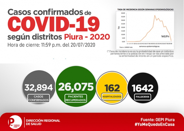 ERP. La Oficina de Epidemiología de la Dirección Regional de Salud de Piura, informó que al 21 de julio, 00 horas, los casos confirmados de COVID-19 son 32,894 en tanto que los fallecidos como consecuencia de la enfermedad suman 1,642. El distrito de mayor incidencia es el de Piura, seguido de Castilla y Sullana, en tanto que la tasa de letalidad se mantiene en el 5.0%.