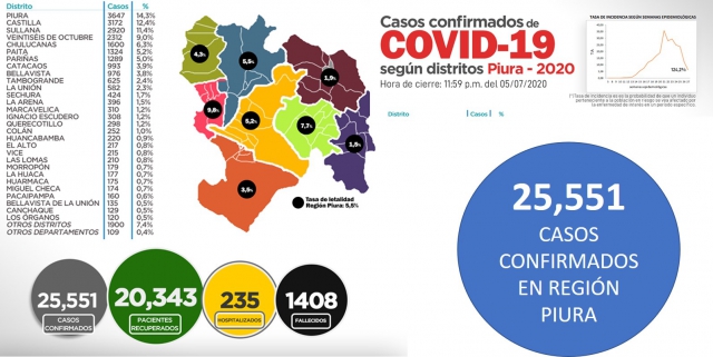ERP. La Oficina de Epidemiología de la Dirección Regional de Salud de Piura, reportó que al 6 de julio 00 horas, los casos confirmados de COVID-19 totalizan 25,551 en la región, en tanto que los fallecidos suman 1,408. Asimismo, desde el inicio de la Emergencia Nacional y considerando el caso cero, 20,343 pacientes se recuperaron de la terrible enfermedad. Por el momento se tiene 235 hospitalizados una cifra menor a semanas anteriores.