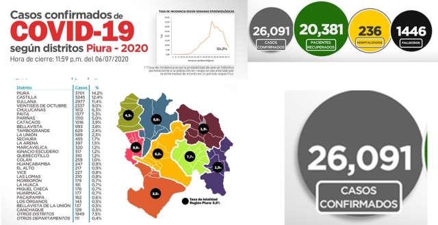 ERP. La Oficina de Epidemiología de la Dirección Regional de Salud de Piura, registra al momento 26,091 casos confirmados de COVID-19, de igual manera 20,381 se recuperaron, 236 se encuentran hospitalizados y desde el inicio de la pandemia se tiene 1,446 personas fallecidas. En la distribución oficial, el distrito de Piura, seguido de Castilla y Sullana, son los que mayor cantidad de contagios tienen.