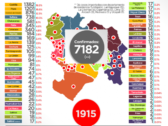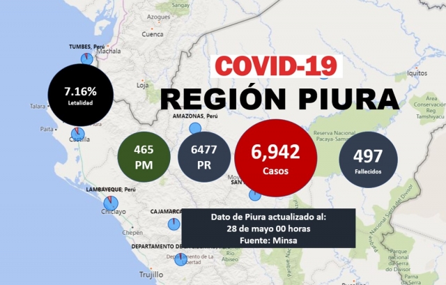 ERP. Al 28 de mayo del 2020, el Instituto de Salud y Centro Nacional de Epidemiología, Prevención y Control de Enfermedades del Ministerio de Salud, informó que la región Piura tiene 6,942 casos confirmados de Covid-19 en tanto que los fallecidos llegan a los 497 personas, lo que implica una letalidad del 7.16%, uno de los más altas de las regiones del país, sin embargo, hubo un descenso alentador.