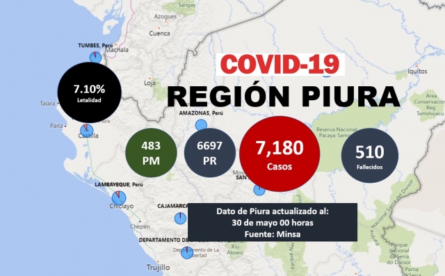 ERP. Al 30 de mayo del 2020, el Instituto de Salud y Centro Nacional de Epidemiología, Prevención y Control de Enfermedades del Ministerio de Salud, informó que la región Piura tiene 7,180 casos confirmados de Covid-19 en tanto que los fallecidos llegan a los 510 personas, lo que implica una letalidad del 7.10%, que implica una disminución relativa en relación a otras regiones del país.