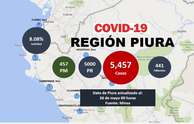 ERP. Todo hace indicar que no se registró la información diaria, consderando que al 26 de mayo del 2020, el Instituto de Salud y Centro Nacional de Epidemiología, Prevención y Control de Enfermedades del Ministerio de Salud, informó que la región Piura tiene a la fecha 5,457 casos confirmados de Covid-19 similar al día anterior; sin embargo registra 441 fallecidos 12 más de los informados en reporte previo.